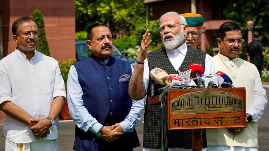 Prime Minister Narendra Modi addresses the media on the first day of the Monsoon Session of Parliament in New Delhi, Thursday, July 20, 2023. Union Ministers Pralhad Joshi, Jitendra Singh, Arjun Ram Meghwal and V Muraleedharan are also seen. (PTI Photo/Vijay Verma)