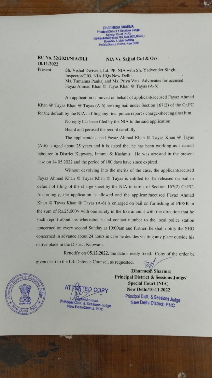 1. Fayaz Ahmad Khan (25), a labourer from Kupwara, Jammu and Kashmir, secured default bail on November 10 last year after the NIA failed to file a chargesheet within the stipulated 180 days (three months). He was arrested on May 14 under the stringent Unlawful Activities (Prevention) Act (UAPA).