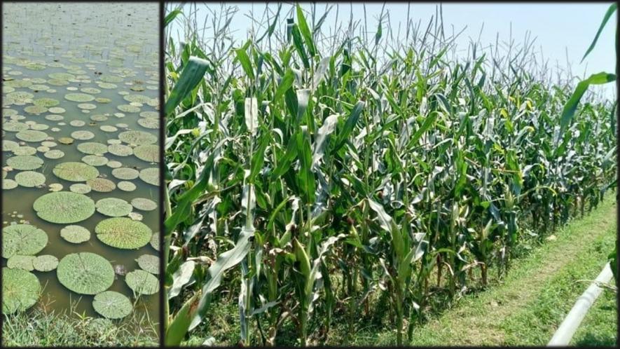 Fox-nut cultivation (left). The maize crop has started bearing fruits which will be ready for harvest by May. (Right)