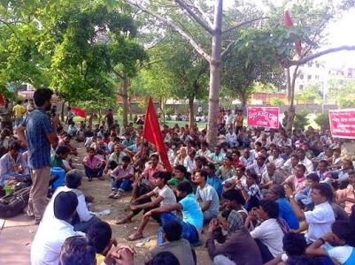 The struggle of the hot rolling steel workers completed one month today and it was also the third day of their relay hunger strike. Today, the workers secured their third victory. After a 22-day long strike of the hot rolling steel workers, the owners were forced to compromise on June 27 and June 28 when they gave in writing to abide by all the labour laws. But they backtracked from the agreement the next day. Consequently the workers' movement continued. The workers went the factory gates daily till 4 July. When the owners did not open the factories for implementing the agreement, the workers even went on to occupy the factory gates. Meanwhile the police arrested the members of 'Garam Rolla Mazdoor Ekta Samiti' and 'Bigul Mazdoor Dasta' twice and the owners even launched an attack through the hired goons, but despite all this the workers got their comrades released and also gave a fitting reply to the goons. The workers commenced their relay hunger strike from July 5 at Raja Park in Wazirpur. The mobilisation of workers was swelling with each passing day and the owners were incapable to run the factories. Today the owners had to respond to the 'show cause notice' issued by the labour department. A delegation of the 'Garam Rolla Mazdoor Ekta Samiti' led by Shivani, Sunny and Raghuraj had also reached the labour department. During the talks, the advocates from the owners' side gave in writing that from now on the workers will not be forced to work for 12 hours a day and all the owners will respect the agreement. After this the delegation of the 'Garam Rolla Mazdoor Ekta Samiti' returned and broke the hunger strike of the comrades and announced the victory.