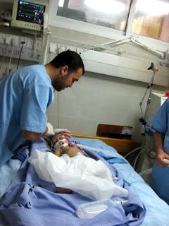 At approximately 1.10pm, as we were leaving the ICU, a 10 month old girl, Haneen Tafesh, was brought into the ward. She was unconscious and her tiny body was grey. She had suffered a skull fracture and brain haemorrhage, which resulted from an attack that took place at around 11am yesterday in Gaza’s Sabra neighbourhood. She was in a coma and on mechanical ventilation. Later in the afternoon, we checked how Haneen was doing and doctors said her condition had deteriorated. After returning home in the evening, we learned that she had died.