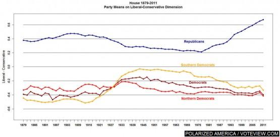 The basic idea goes something like this. Southern white flight from the Democratic Party, motivated as it was by the compatibility of purist economic libertarianism with de facto segregation, produced especially conservative Republicans. This hardline opposition to intervention in the marketplace survived the death of open segregationism, and as Southerners became more and more critical to the Party’s national fortunes, their brand of libertarianism gradually began to dictate the party’s ideological agenda. Primaries enforced the party line nationally, driving out moderate non-Southern Republicans and making the party’s representatives nationally fit the Southern-cast mold.