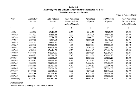 Agriculture is a highly sensitive sector for the Indian Economy, as it supports the bulk of the rural population in terms of employment and livelihood. Traditionally, India has been a net exporter of Agricultural products. Agricultural imports form a very small portion of our total import bill (around 3-4%) while it has accounted for over 10% of our exports earnings over the last 2 decades post liberalization. This is primarily because this sector has still being protected to some extend from the vagaries of international trade despite repeated pressures to liberalize the sector.