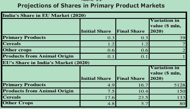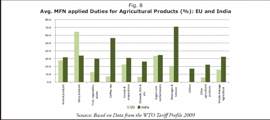 While Tariff negotiations at the WTO are on bound rates (maximum applicable rates), which is different from actual rates imposed. EU average bound agricultural tariff rates are very low (15.9% in 2009) compared to India (114.2% in 2009). If current reports of the FTA commitments to bring tariff rates to 0 or near 0 for 90% of products mean India stands to face massive protection loss, much more than EU. Infact, the CEPII-CIREM study concluded that given 29.9% of India’s agricultural exports to EU are already duty free while the rest face low EU tariffs, India’s gain in agricultural exports will hardly increase, as compared to EU’s exports which is poised to gain substantially.