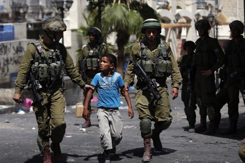 Israeli soldiers arrest a young Palestinian boy following clashes in the center of the West Bank town of Hebron, on June 20, 2014. Israeli soldiers killed a 14-year-old Palestinian in the occupied West Bank as they pressed a crackdown on the Islamist movement Hamas in their search for three missing Israeli teenagers. (Photo: AFP-Thomas Coex)