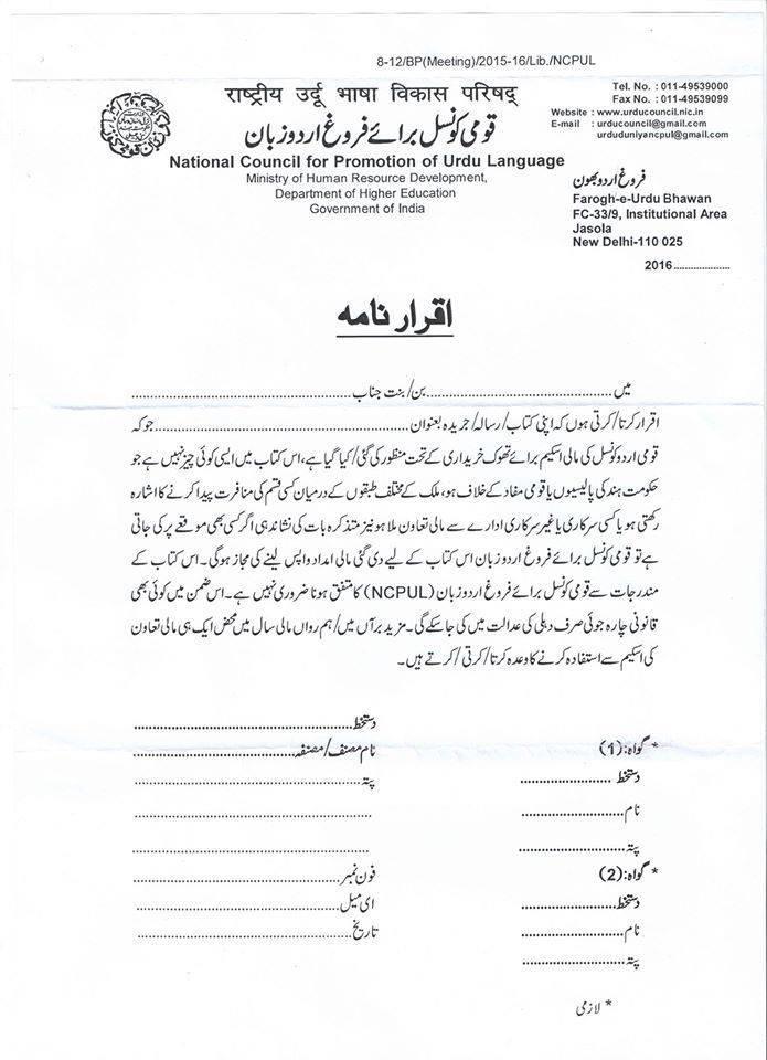 On March 17, 2016, Kolkata-based Urdu poet and writer Professor Shahnaz Nabi shared an alarming document with other Urdu language writers—a form she had received from the National Council for the Promotion of the Urdu Language (NCPUL), which operates under the Ministry of Human Resources Development. The form requires Urdu authors to declare in writing that the text of their literary or critical works isn’t against the policies of the Indian government or the country, and will not cause any sort of enmity between the different communities in India. It is a document directly in contradiction with the Constitution of India.