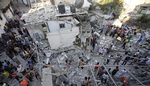 Rescue workers search for victims as Palestinians gather around the wreckage of a house destroyed in an Israeli airstrike that killed at least nine members from the al-Ghoul family, in Rafah, southern Gaza Strip, Aug. 3, 2014. (photo by REUTERS/Ibraheem Abu Mustafa)