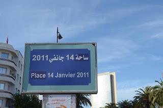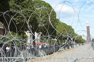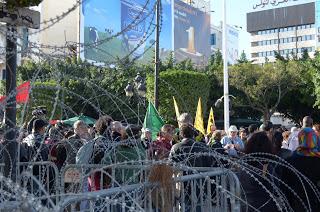 The march began in Habib Bourguiba Avenue, at Place 14th January 2011; the date marks the Tunisian revolution which overthrew Ben Ali. Ironically, the same area is heavily guarded by police and ringed with barbed wire – to protect the French Embassy at one end and the Ministry of the Interior on the other.