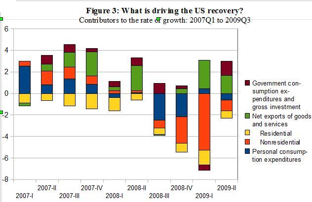 After analysing various components of demand and their behaviour during the 'recovery period', we can say that the increased government expenditure in the US through the fiscal package has still not been able to stimulate the economy to the extent of alleviating the problem at hand. On the one hand, consumption has stagnated, thereby, terminating the route to recovery through an increase in the multiplier. On the other hand, neither the residential investment nor the non-residential investment is showing any sign of recovery, especially since the level of confidence of the corporations to invest is still quite bleak. Therefore, it would be prudent for the Obama administration not to withdraw the stimulus just as yet. Otherwise they would face what the US had faced during the Great Depression viz. the decision to withdraw the stimulus based on the initial signs of recovery ended up in prolonging the crisis which eventually lasted for almost a decade.