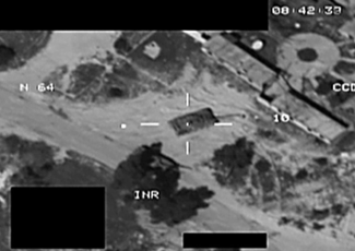 Still image taken from footage from an RAF Tornado GR4, showing the aircraft using Brimstone Missiles to destroy a Main Battle Tank in Libya during Operation Ellamy in 2011. Image from Wikimedia Commons.