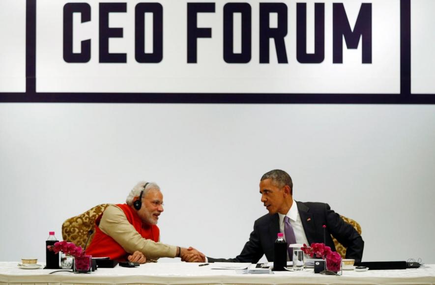Prime Minister Modi with President Obama during the CEO roundtable organised at the India-US Business Summit in New Delhi, January 26, 2015. Photo: Reuters/ Jim Bourg.