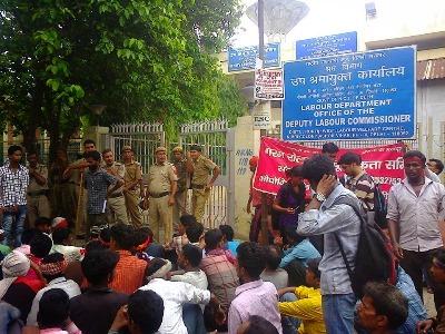 Around 1000 workers from the Wazirpur industrial area marched towards the office of the Deputy Labour Commissioner, Ashok Vihar for a gherao this afternoon. They do not plan to return to Wazirpur unless strict action is taken against the owners for not following labour laws. The police, acting on behest of the factory owners, are continuously threatening the workers. Following is a letter appealing to the Labour Commissioner to take immediate action against the hot rolling factory owners who are violating a binding legal agreement with the help of the police and hired local goons.